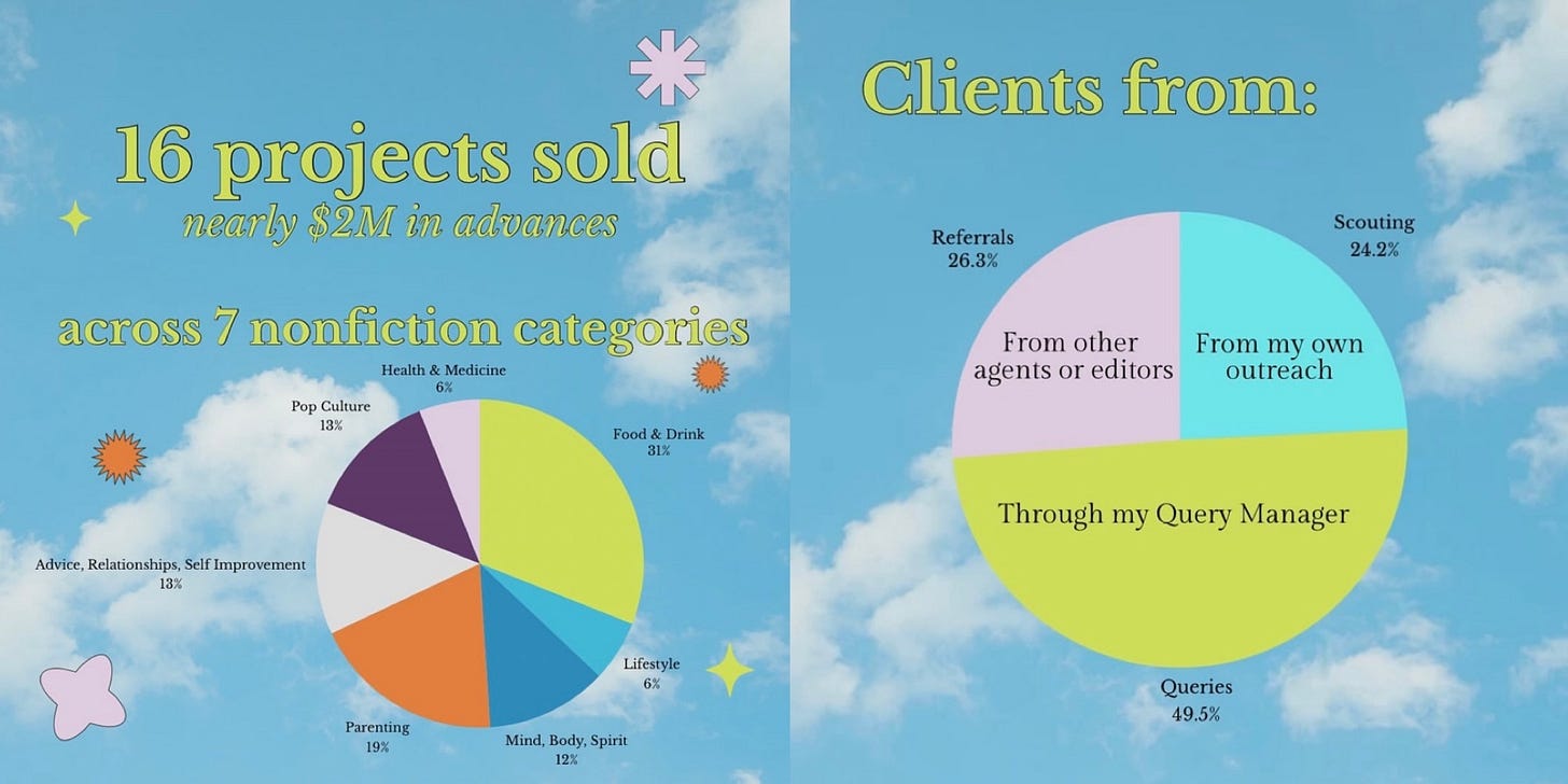 I have shared my story of becoming an agent in a few different places, but I did not start representing clients until fall 2023 when High Line Literary officially launched. So last summer on our one year anniversary of being open, I shared on my instagram some images that recapped my first year as an agent. I wasn’t expecting how popular it would be at the time but now know why: because no one else is ever transparent about their numbers.